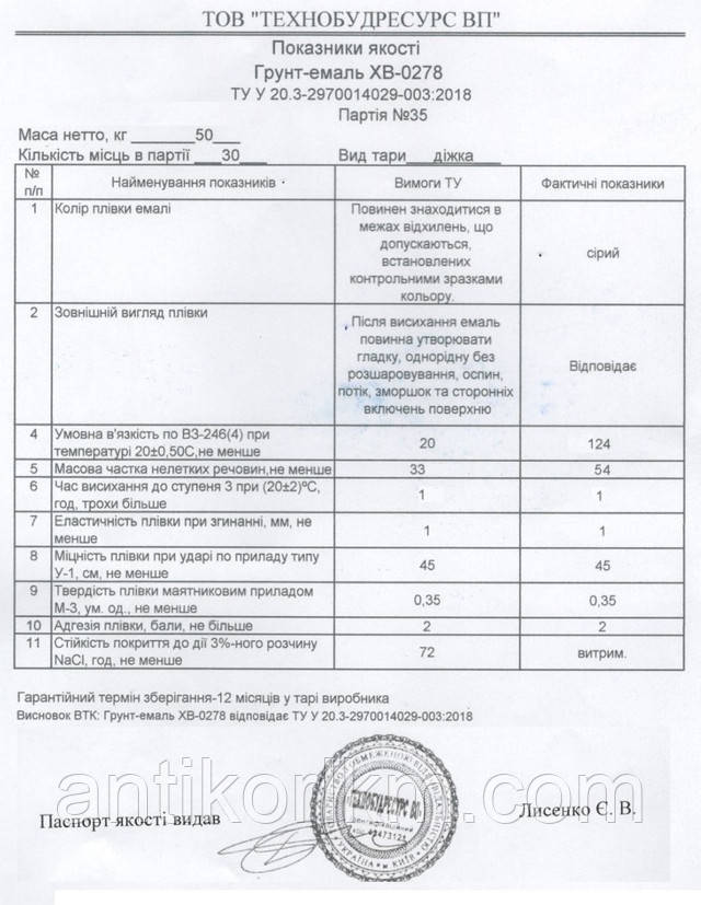 Склад: суспензія пігментів, наповнювачів і модифікатора іржі в розчині полівінілхлоридної хлорованої смоли з додаванням пластифікаторів в суміші органічних розчинників.